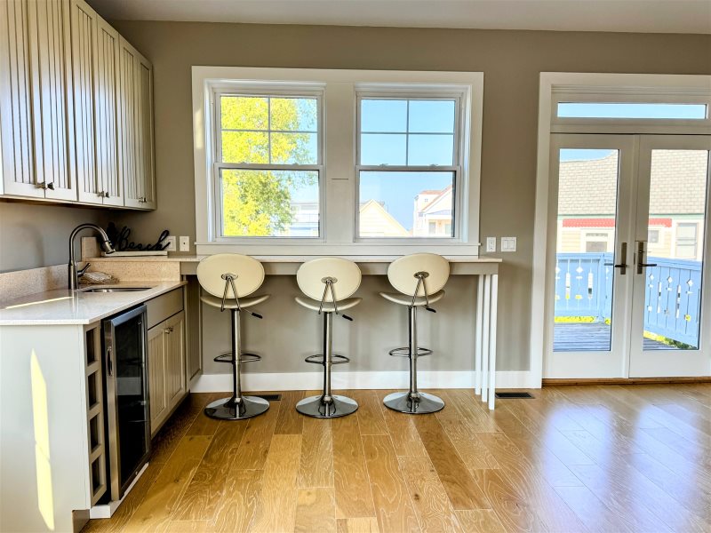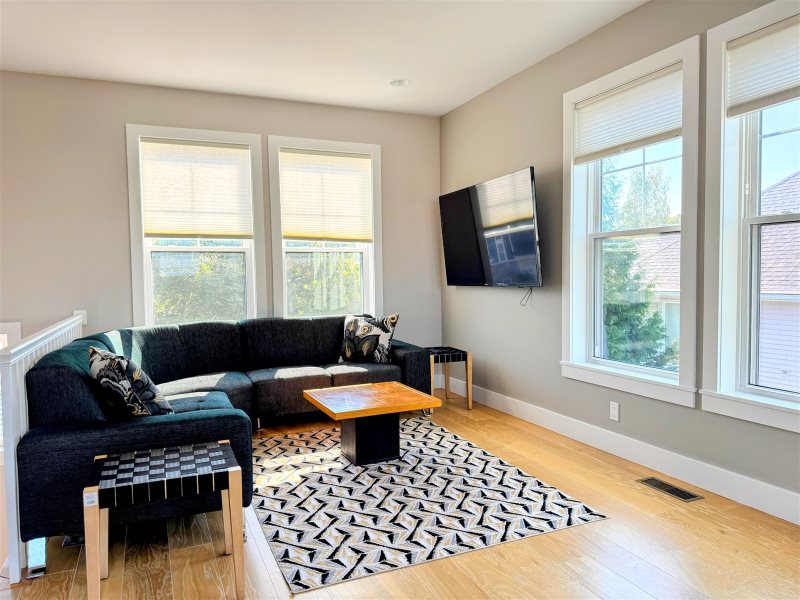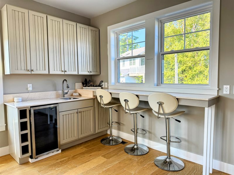 At the top of the home, you'll find a light-filled third-floor lounge designed for elevated relaxation. This beautiful space features a sleek wet bar, bistro-style seating, a smart TV, and access to a private balcony — perfect for evening cocktails, a quiet morning coffee, or catching up on your favorite series in peace. It’s a grown-up retreat within the home, offering a little extra room to unwind in style.