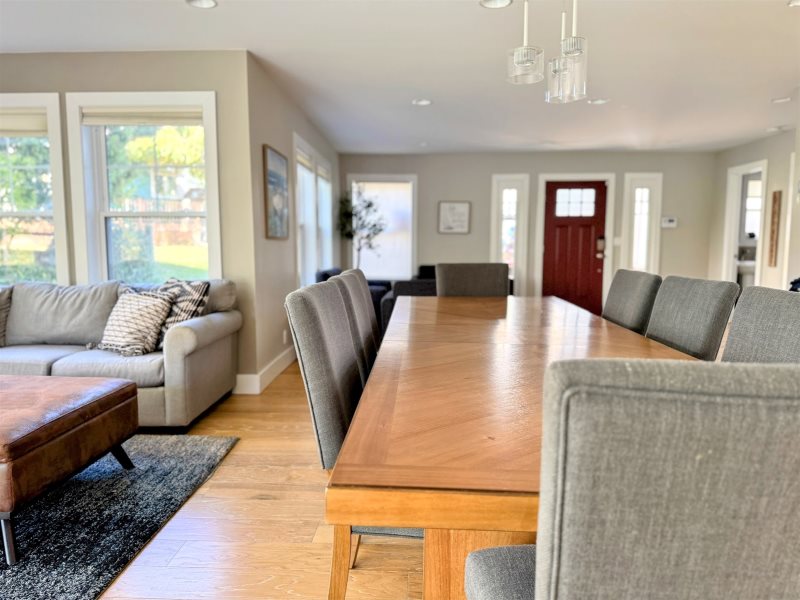 Step inside and you'll be greeted by warm natural light, sophisticated finishes, and an open-concept living space that was designed for connection. The main living area includes a stylish seating arrangement, a large dining table, and a modern kitchen with all the tools and touches you’d expect from a luxury rental. There's room to cook, eat, laugh, and unwind — together.